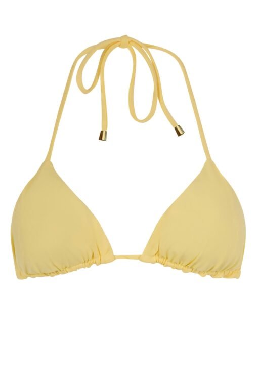 O top Amarelo Manteiga da coleção RIO, combina elegância com o melhor do design brasileiro. Ele apresenta cortininha deslizante ajustável, bojo removível e amarrações delicadas no pescoço e nas costas. A mistura perfeita entre conforto e sofisticação para um visual de verão moderno e luminoso.